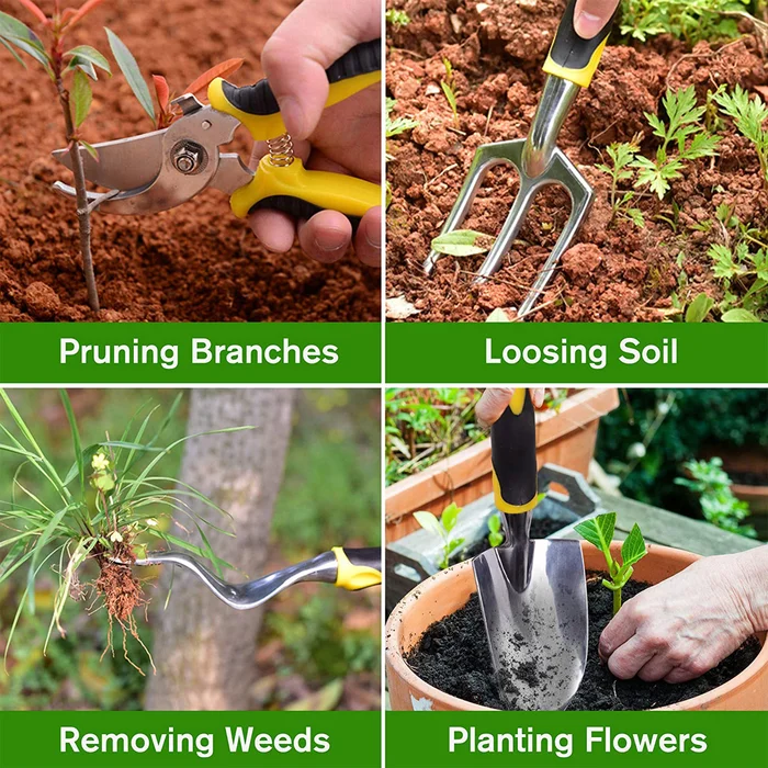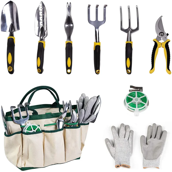 - 9 PCS KIT: Contains 6 tools, a tote bag, a pair of gloves and a garden cord. Weeding, planting flowers, building branches, loosening soil and more, it will meet all the needs of your garden