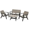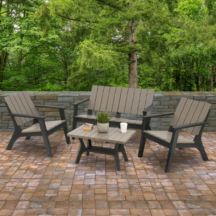 This indoor/outdoor conversation set is constructed of high-strength injection molded polypropylene material that is durable, weather-resistant, and long-lasting. Each piece has a wood textured finish in complimenting, all tailored to withstand harsh outdoor elements. Tabletop and seating surfaces feature a clean, classic slat styling. This sturdy yet lightweight set includes a coffee table plus two chairs and a loveseat, all with a relaxed-back design and comfortable armrests. Pieces are easy to maintain and care for.