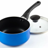 The 7-Piece Starter Non-Stick Cookware Set has thick gauge aluminum provides even heat conduction and prevents hot spots. Nonstick coating for food release and lasts long. Tempered glass lids with steam vent for viewing food while cooking. Riveted soft touch handles stay cool when cooking and are comfortable works on gas, electric, glass, halogen, ceramic, etc. Not induction compatible and not oven safe. Dishwasher safe and easy to clean.