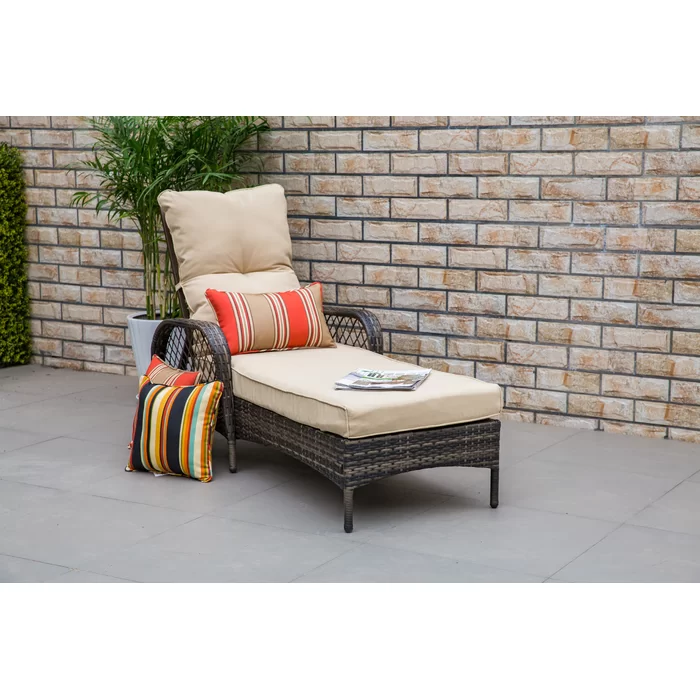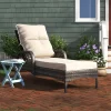 Relax on your patio or porch in classic style on this 66” long reclining chaise with cushions. It’s made of steel gray-brown resin rattan, which is resistant to water, fading, mildew, and rust. The chair features curved arms and a straight back that reclines in five positions, including fully flat for napping or sunbathing. The back and seat cushions are filled with polyester and covered in a polyester blend, which is water repellent and resistant to fading; the back cushion features distinctive button tufting, offering a tailored look, while side ties attach both cushions to the frame with ease.