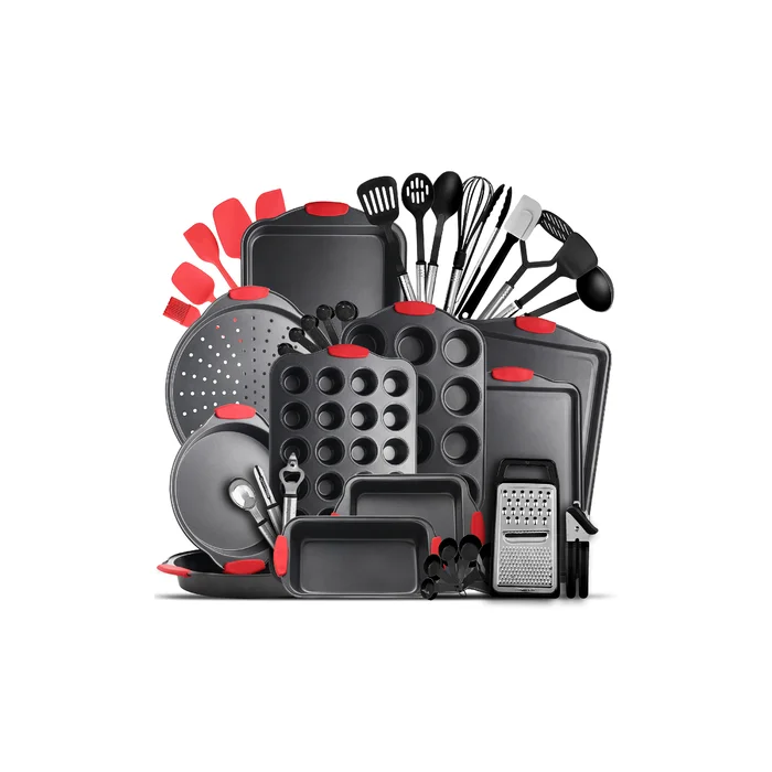 1 mini muffin pan (24 cups) 17 x 10.6 inch, 1 muffin pan (12 cups) 16.4 x 10.4 inch, 2 round pans 11.3 inch, 1 square pan 11 x 9 inch, 1 small cookie sheet 15.7 x 10.25 inch, 1 large cookie sheet 17.5 x 12 inch, 1 large baking pan 17.9 x 11.5 inch, 1 pizza pan 14.7 inch, 1 loaf pan 5.9 x 11.75, 1 small spatula 8.3 inch, 1 large spatula 10.7 inch, 1 small turner 8.3 inch, 1 large turner 10.8 inch, 1 brush 8.2 inch, 1 soup ladle, 1 solid spoon, 1 slotted spoon, 1 solid turner, 1 slotted turner, 1 potato pusher, 1 can Opener, 1 whisk, 1 grater, 1 spatula, 1 tongs, 1 ice cream scooper, 1 wine opener, 1 peeler, 5 measuring cups (1 cup, ½ cup, ⅓ cup, ¼ cup, ⅛ cup), and 5 measuring spoons (1 tbsp, ½ tbsp, 1 tsp, ½ tsp, ¼ tsp).