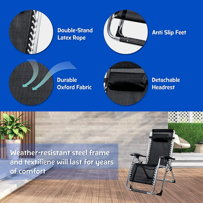 luxurious Zero Gravity Lounge Chair – Premium quality with an inspired design perfect for both indoor and outdoor enjoyment. The reinforced metal frame makes this chair much stronger and more stable than others. It can hold up to 440 pounds. It features a thick, soft removable cushion that extends throughout. There is also a head pillow for head and neck support. The cushions can be removed in hot weather to reveal the breathable mesh material underneath. Ideal for backyard in summer, by the pool, or at the lake or beach. The back reclines from upright 90 degrees to laying down 170 degrees and all positions in between. Perfect for everything from reading and watching movies to catching a restful afternoon nap./p product Features:BR /Zero Gravity Lounge Chair by /Premium quality with inspired designer /Super strongholds up to 440 pounds (220kg)or /Thick, plush cushion throughout /Head pillow for head and neck support /Cushions are removable by /Strong mesh material underneathbr /Breathable and cool for warm Weatherby /30″ back, 18″ seat area, and 19″ space for legs /Folds to compact 26×37″/p pGet Yours – We have this remarkable Zero Gravity Lounge Chair in a fresh shipment ready to send directly to your door. Many customers love the look and quality so much they return to buy another. It makes a much appreciated gift for friends, family, and co-workers who like exceptional comfort./p