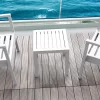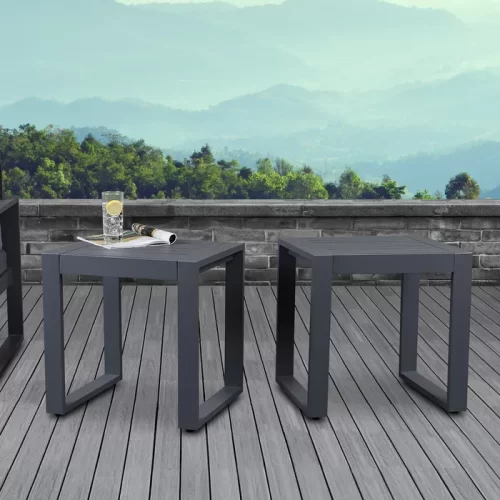 Streamlined and stylish, this patio side table exudes a simple contemporary design. Crafted of commercial-grade material in a weatherproof finish, this side table strikes a clean-lined square silhouette on four straight legs. Rounding out the design, the slatted tabletop lets rainfall right through to encourage quick drying. This table provides a perfect platform for displaying drinks and appetizers at your next backyard bash.