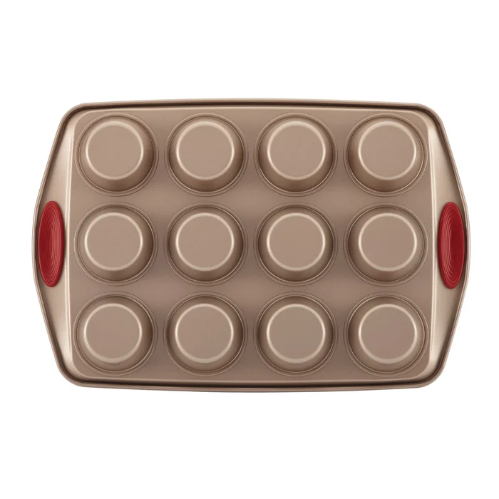 From crispy fries to a fast batch of corn muffins, this Rachael Ray Cucina Nonstick Bakeware 10-Piece Baking Pan Set is perfect for cake making, cookie making, roasting, and baking tasty oven-made treats. This nonstick bakeware set is constructed from heavy gauge steel that is ready to bake everyday or just once in while, with great results. Long-lasting, latte-colored nonstick inside and out of the baking pans provides outstanding food release with quick cleanup, and the bake pan set includes all the essential shapes for delish baking results, including a cake pan with a convenient lid for bringing goodies on the go (lid not intended for oven use). Each baking sheet, cake pan, loaf and muffin pan is made with rolled rims, and is oven safe to 450°F. (cake pan lid not intended for oven use). Heat-safe silicone grips on the generous handles provide plenty of comfort and control (even with your favorite potholders on) and add a pop of modern-rustic kitchen color. Enjoy easy, delicious roasted and baked foods with the distinctive, durable Rachael Ray Cucina Nonstick Bakeware 10-Piece Baking Pan Set.