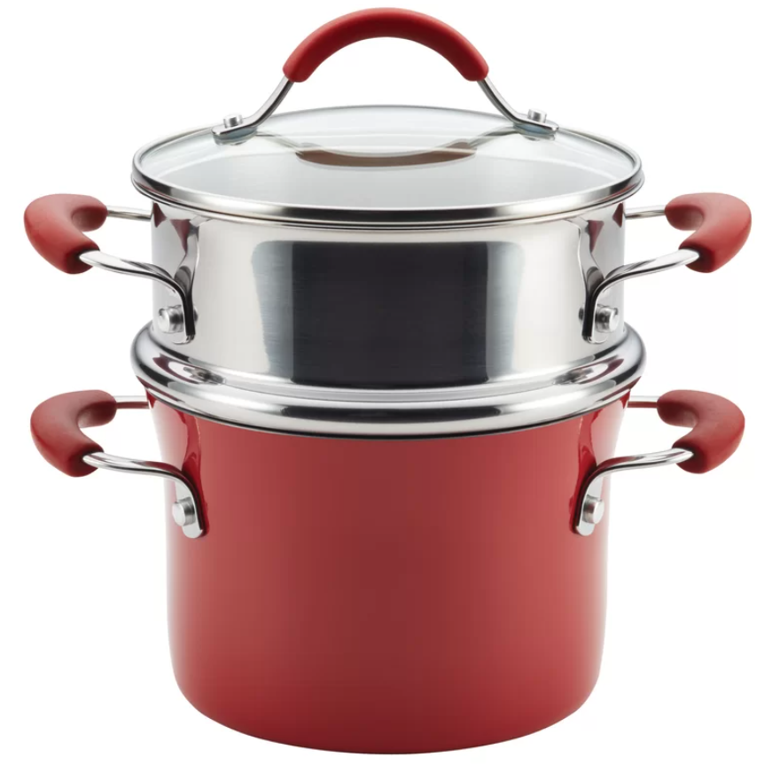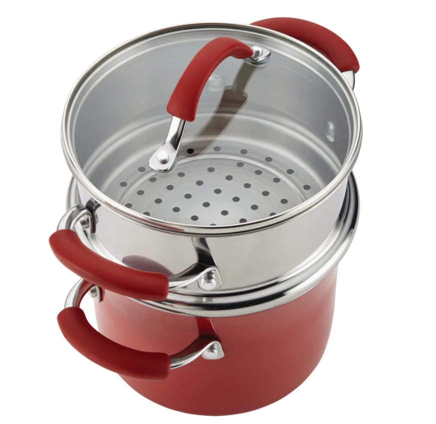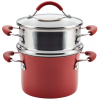 Give veggies and more the steam treatment with the handy Rachael Ray Cucina Hard Enamel Nonstick 3-Quart Covered Multi-Pot Set with Steamer. This convenient three-piece steamer set offers a fast and easy way to steam everything from garden-fresh veggies to plump, briny shrimp to piquant tamales and more. The saucepot features durable aluminum construction to promote fast, even heating while helping to reduce hot spots. The sturdy hard enamel steamer set exterior features warm, welcoming color in Rach’s rustic-modern Cucina palette. A shatter-resistant glass lid keeps the steaming and cooking action visible and the heat and moisture inside. And the saucepot, lid and polished stainless steel steamer basket sport coordinating, grippy rubberized handles that are double-riveted for plenty of solid, comfortable support. Rachael’s stylish color sense meets convenience with the distinctive espresso-colored, PFOA-free nonstick that releases foods effortlessly, complements the exterior, and cleans up easily. Oven safe to 400°F, the steamer set is suitable for all stovetops, except induction. Get steamed in the most positive way with this easy-to-use Rachael Ray Cucina Hard Enamel Nonstick 3-Quart Covered Multi-Pot Set with Steamer.