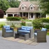 Bring a breezy style and seating to any outdoor arrangement with this product, complete with one loveseat, two armchairs, and one rectangular coffee table with an easy-to-clean tempered glass top. Foam-filled cushions with polyester-blend upholstery top each seat, providing 3″ of cushioning as you kick back and relax. To clean, we recommend spot cleaning using a cloth with warm water and mild soap.