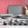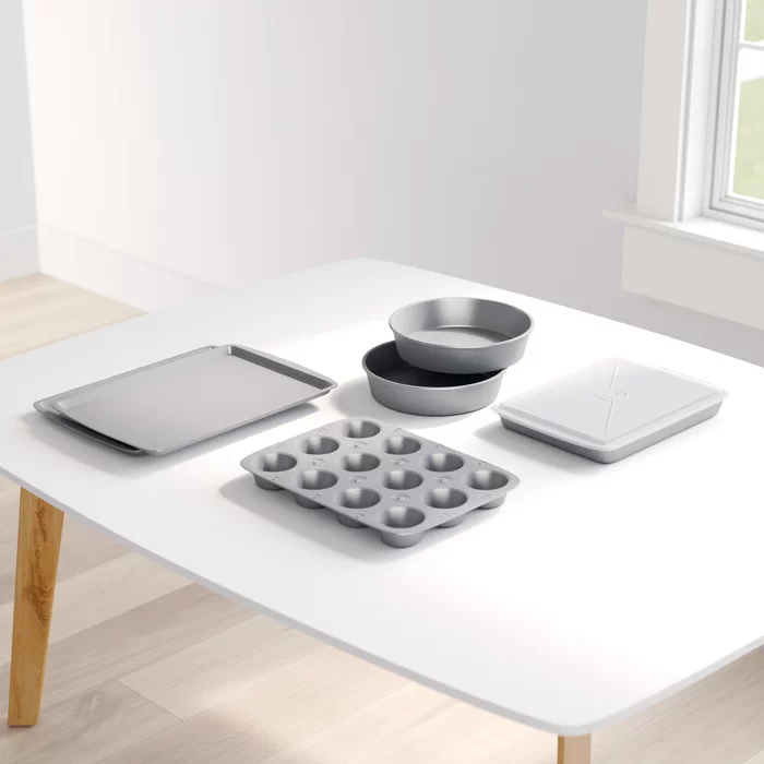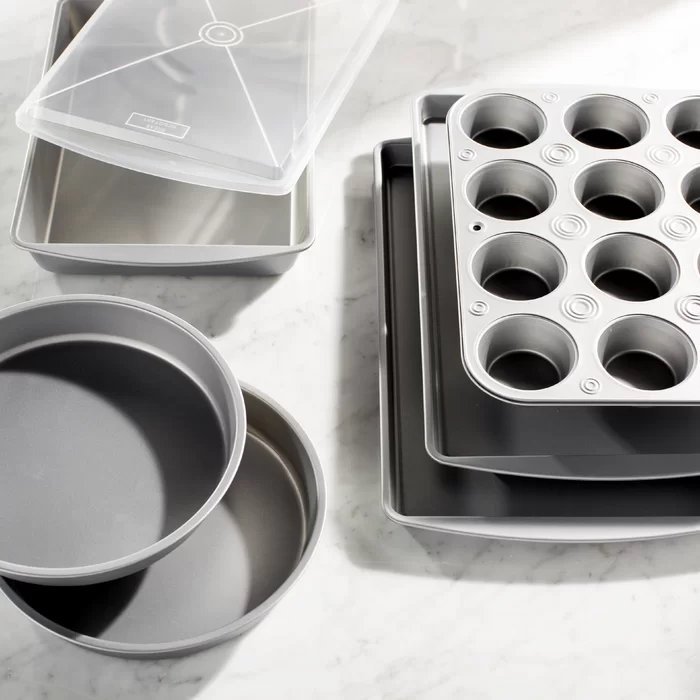 Break out your favorite blueberry muffin or chocolate chip recipe and get to bakin’ with this essential 7-piece bakeware set! This handy set includes two cookie pans, two round cake pans, a covered bake/roast pan with a plastic lid, and a 12-cup muffin pan. Each piece is crafted from steel and comes with a non-stick finish that makes sure all your cookies and cakes don’t stick to the pan. Plus, each piece is dishwasher-safe, making clean up post-dessert a breeze.