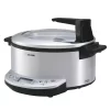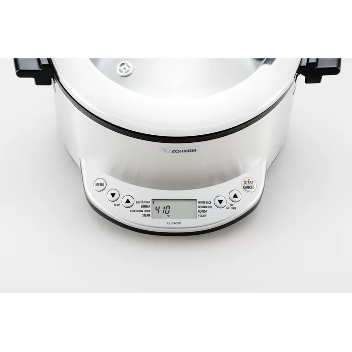 The multicooker features 9 convenient menu settings for a variety of cooking possibilities. The heavy-duty capacity tri-ply stainless steel cooking pot with resin handles resists corrosion and rusting, and its diameter accommodates large cuts of meat. 9 Convenient menu settings include sauté/sear, simmer, low/slow cook, steam, white rice, brown rice, quinoa, yogurt and keep warm.